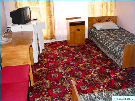 Все номера с удобствами (душ, туалет), цветным телевизором, холодильником, с лоджией с боковым видом на море. На каждом этаже - холлы, оборудованные мягкой мебелью и телевизором. 1-но местные номера с кондиционером; 2-х местные номера; Возможно размещение с подселением в 2-х местных номерах. Дополнительное место – раскладушка. |