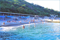 Пляж: собственный, галечный, в 200 м от корпусов санатория, спуск на пляж по канатной дороге около 2 минут. Оборудован кабинками для переодевания, навесами, лежаками. Платные услуги - бар, прокат пляжного оборудования и водных средств.