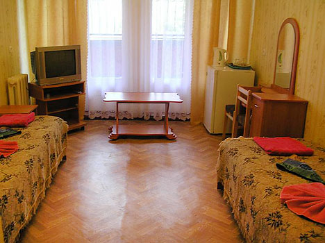 | 1-2-местный улучшенный (с ремонтом) номер (~ 12 кв.м) с удобствами (душ, умывальник, туалет - с/у совмещенный, новая сантехника ), ТВ, холодильник. Также в номере имеются: 2 коврика на полу, встроенный шкаф, 2 тумбочки, журнальный столик, радио, 2 стула, бра. Лоджия (4 кв. м). Кровати - раздельные деревянные, доп. место – раскладушка.