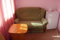 2-местные номера с удобствами, ванная комната с душем, телевизор, холодильник, высокие потолки, южные номера с балконом и видом на море, северные без балкона и вида на море.