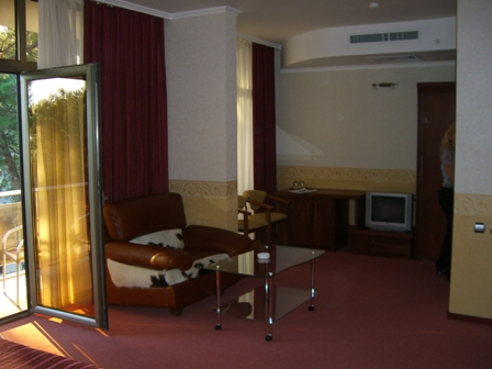 люкс. В номере: два санузла (один с большой угловой ванной, другой, гостевой, с душевой кабиной), ТВ, кондиционер, мини-бар, мини-сейф, телефон, балкон.